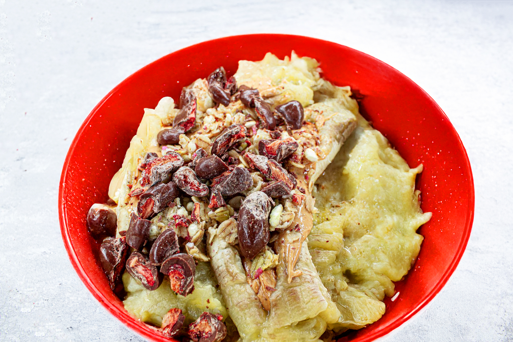 To make this recipe you need to bananas, with the skin still on. Cut the bananas in half lengthwise, with the skin on. Add bananas to your air fryer for 5 minutes. Once finished cooking, top with peanut butter, granola and Crunchies Freeze Dried Strawberries in Milk Chocolate.