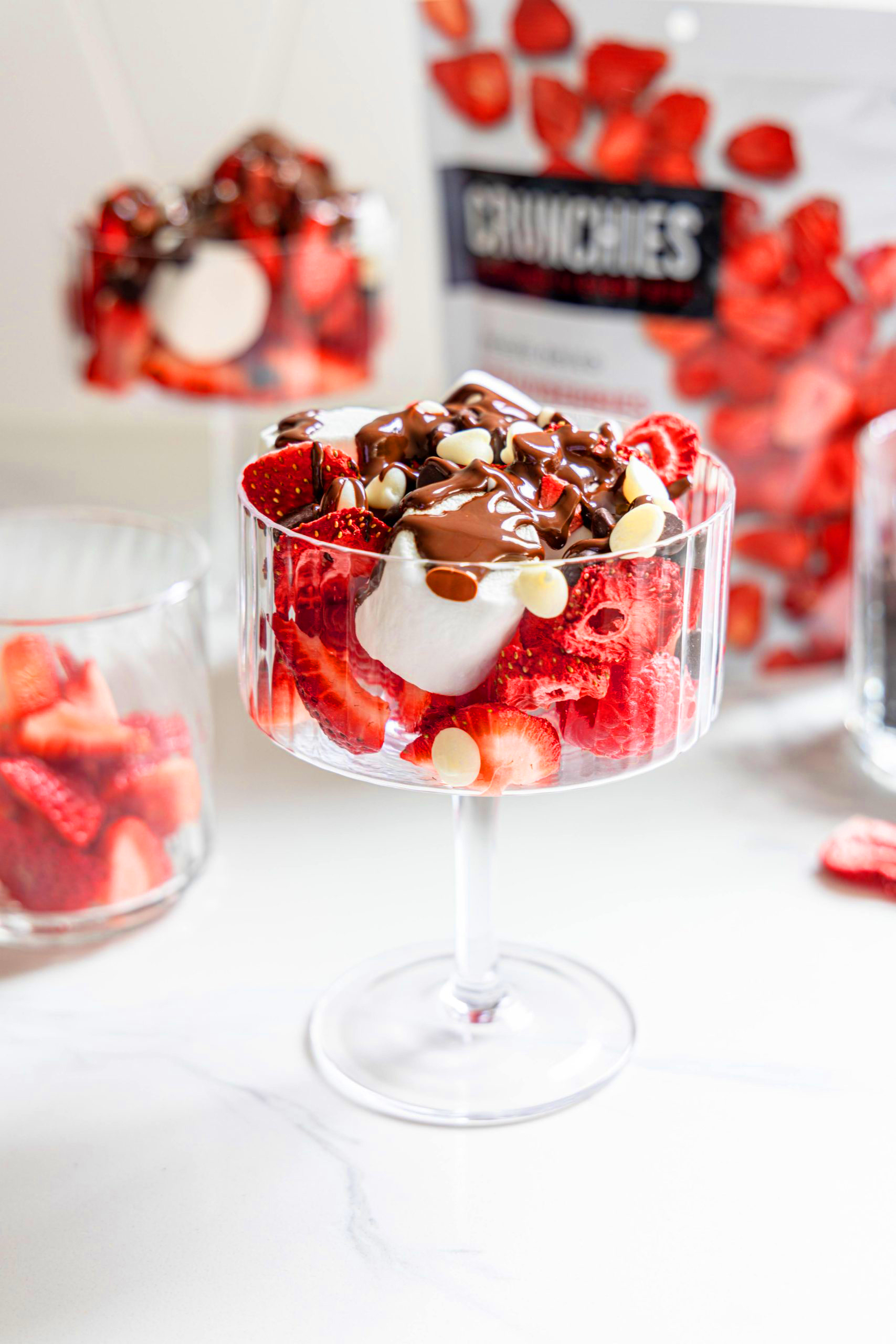 To make this recipe we added fresh strawberries, marshmallows, dark chocolate chips and Crunchies Freeze-Dried Strawberries to a dessert cup. We then drizzled hot chocolate sauce onto our creation. You can make this ahead of time for a party (just make sure to refrigerate) or eat it immediately like we did!