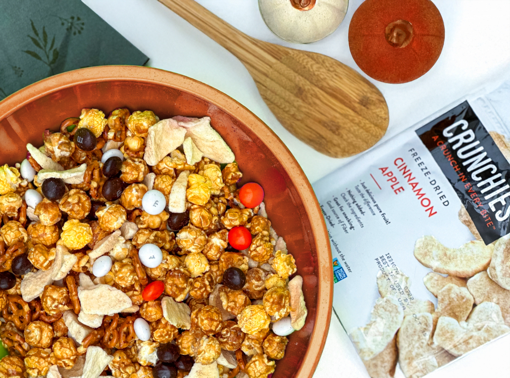 Our Cinnamon Apple Harvest Mix is easy to make and even easier to bring on-the-go. Life is busy and you shouldn’t have to compromise with bland snacks. To make simply combine caramel popcorn, Crunchies Cinnamon Apple, pretzels and M&M’s. This Cinnamon Apple Harvest Mix combines both sweet and salty flavors to give you one delicious snack!