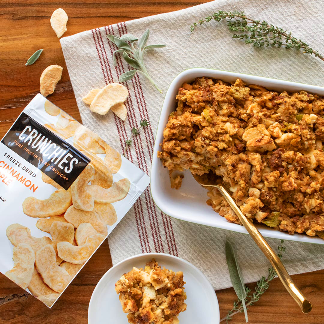 Let’s get ready for Thanksgiving with a simple recipe incorporating some of our favorite Crunchies! Feast your eyes on our take on stuffing, this Herbed Stuffing with Crunchies Free-Dried Cinnamon Apples, sage, onions and celery. Make it as a fun side dish for your Thanksgiving feast, it’s sure to be a crowd-pleaser!