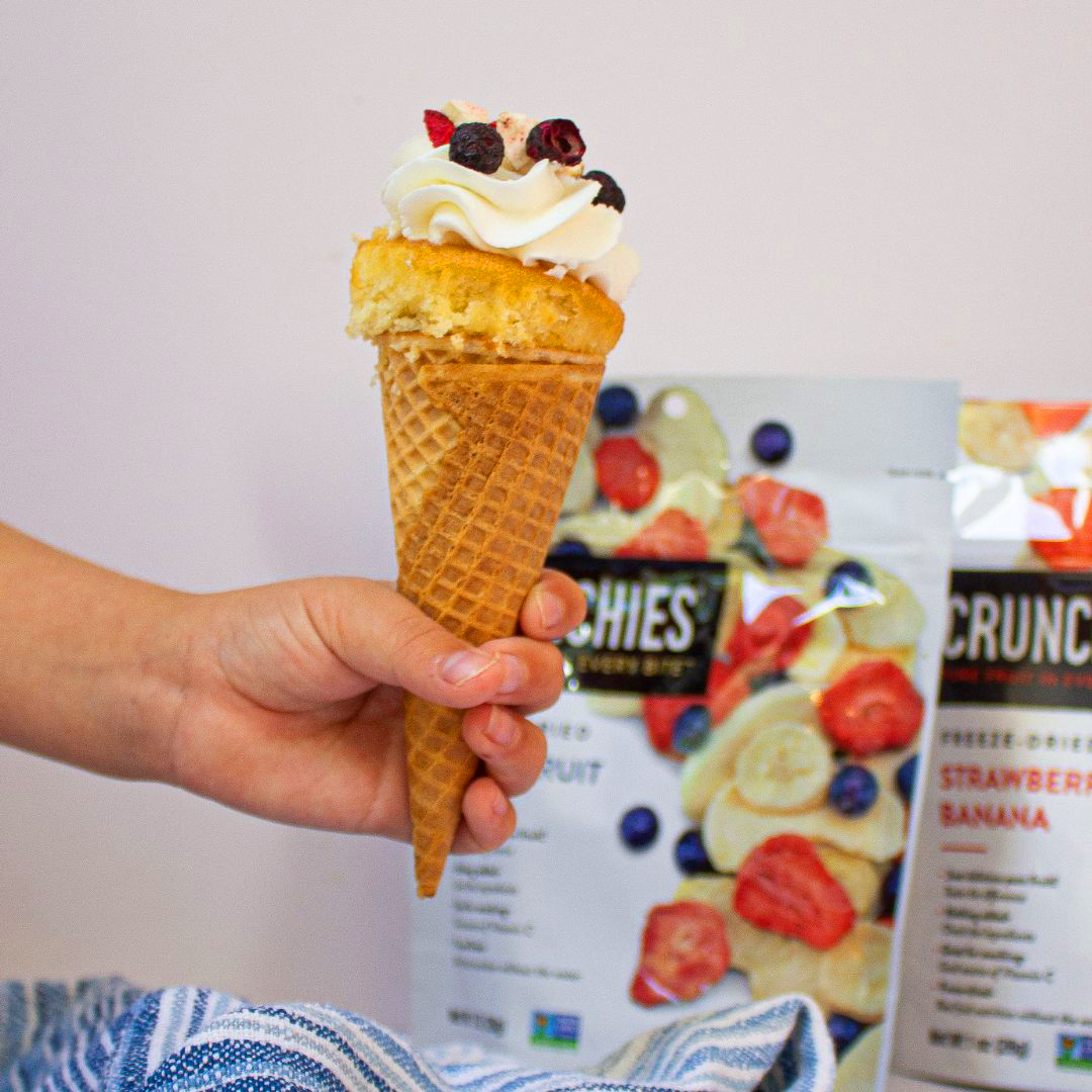 This recipe is incredibly easy. Simply place your cupcake inside the ice cream cone and then top with Crunchies Freeze Dried Mixed Fruit. Yummy!