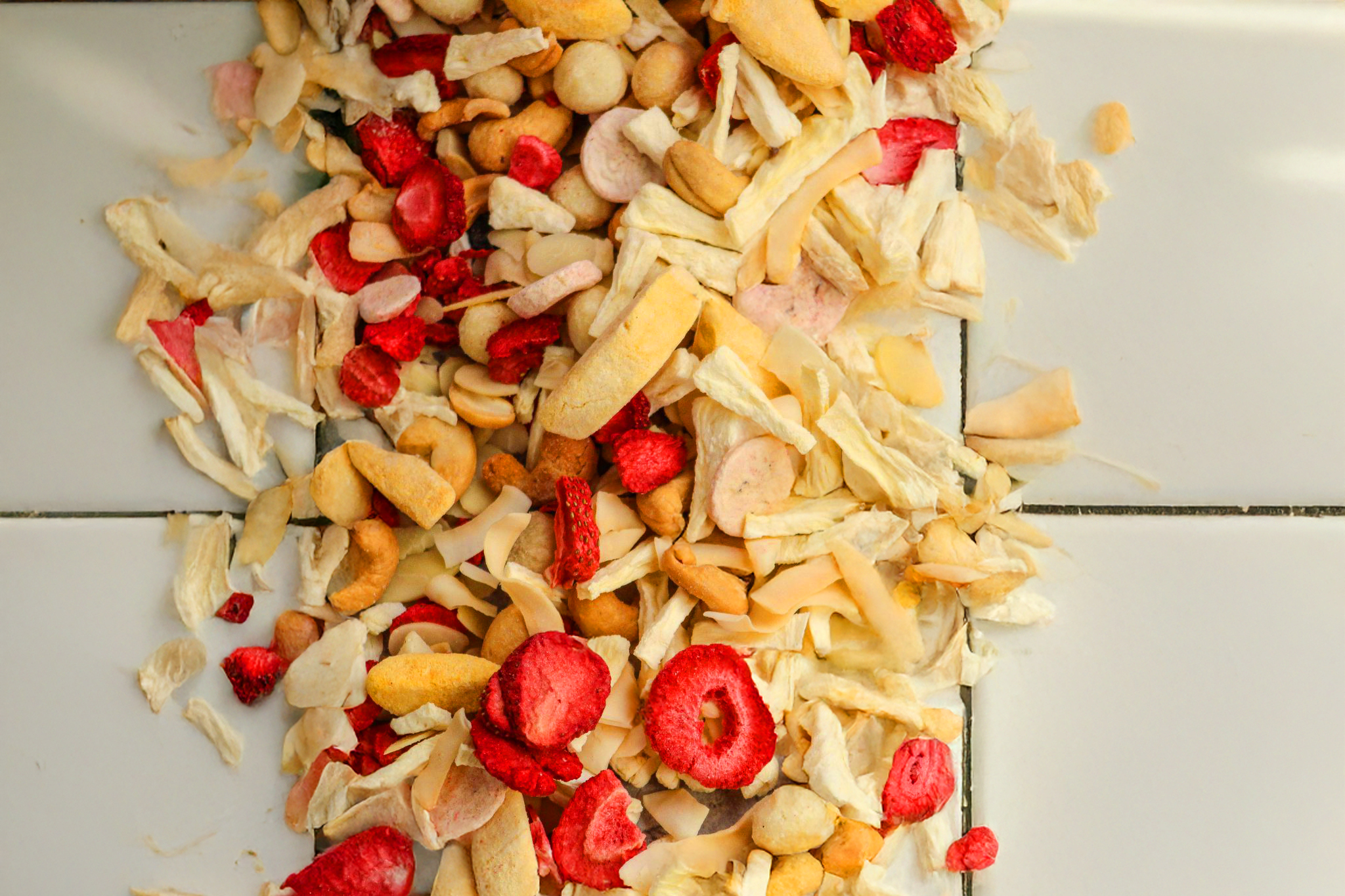 This recipe for Island Time Trail Mix will make your taste buds feel like they’re in the tropics! This trail mix recipe is full of pineapple, mango, banana and strawberries along with nuts and coconut! Yum!